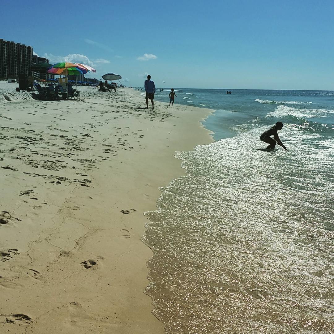 Little girl looks for shells as the sun glistens in the waves coming ashore. #OrangeBeachCondo #orangebeach #alabama #beach #SaltLife